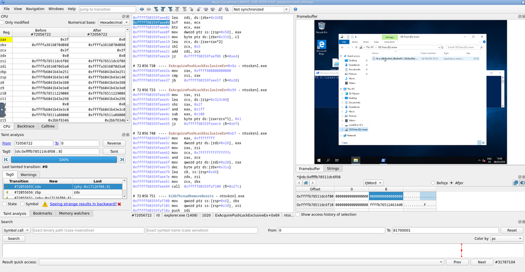 To help you get started, esReverse offers comprehensive knowledge materials that guide users in maximizing the advantages of time travel analysis, integrating tutorial notebooks that provide detailed guidance on environment preparation (such as setting up a Microsoft Windows VM) and techniques for framing complex traces. Once a trace is available, other advanced techniques like taint analysis can be employed.